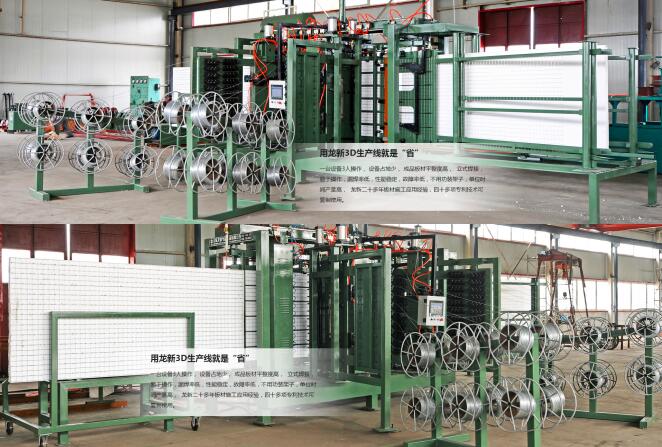 公司自主研發和生產的立式插絲焊接機具有自動化程度高、易操作、用工少、產品質量穩定、不用裝功能架子、更換品種方便、產量高等多種特點,大大減少人工等其他費用的成本,2-3人便可使機器正常運轉。龍新二十多年板材生產和施工應用經驗,四十多項專利技術可復制使用。暢銷二十多個國家和地區。